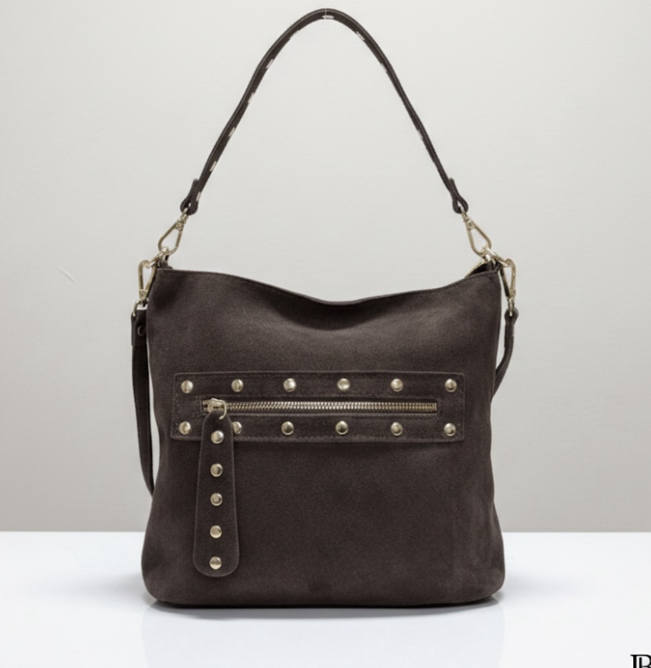 Descubre el equilibrio perfecto entre sofisticación y carácter con nuestro bolso Grazalema. Confeccionado en ante de primera calidad y decorado con tachuelas doradas, este diseño hobo es el accesorio versátil que transformará cualquier look, aportando un toque artesanal y moderno a tu día a día. Incluye asa larga bandolera