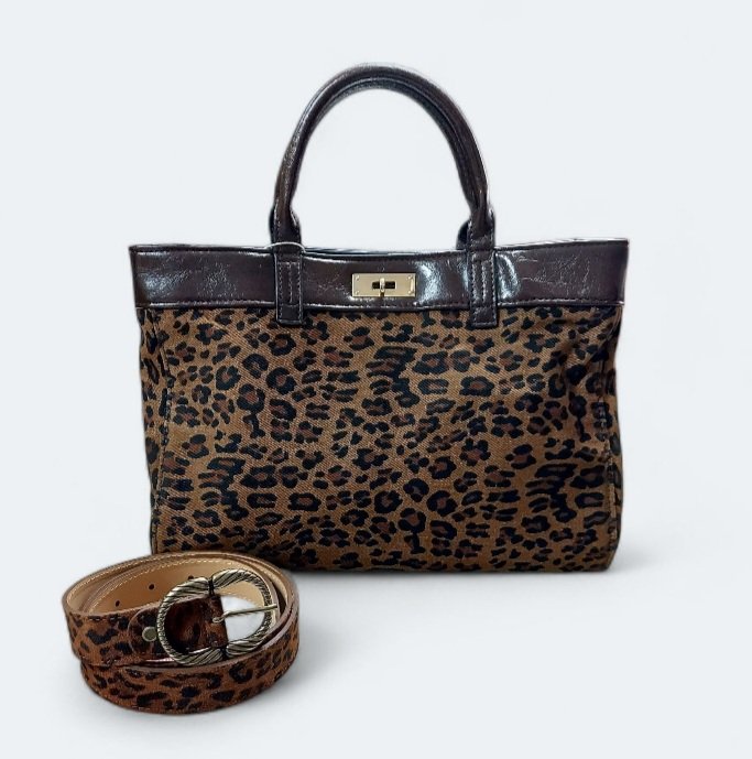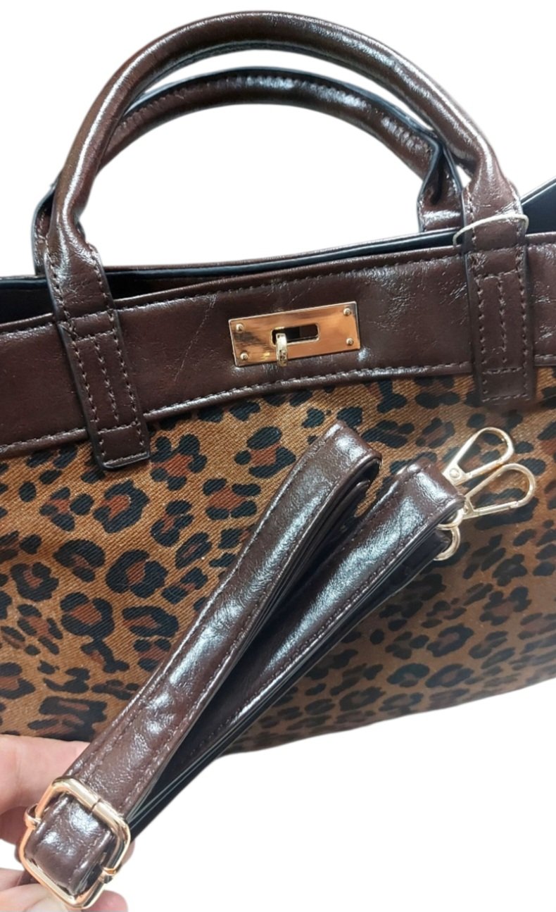 El bolso Leo presenta un diseño de estampado de leopardo en tonos marrones y negros, complementado con detalles y asas en un tono marrón oscuro brillante. Tiene posibilidad de colgarlo en el hombro o estilo bandolera ya que trae una correita marron de quita y pon, su cierre es metálico dorado en la parte frontal, su forma es ideal para llevar objetos personales con estilo.