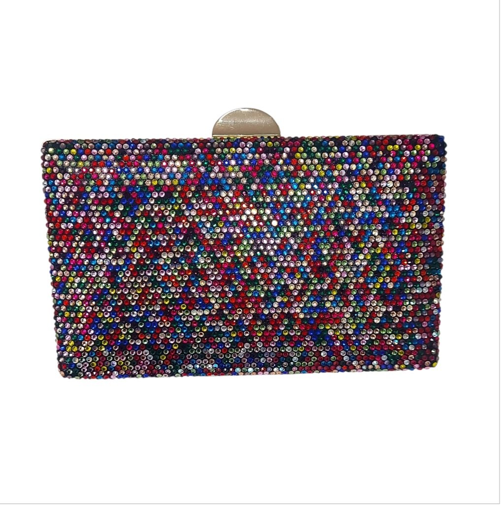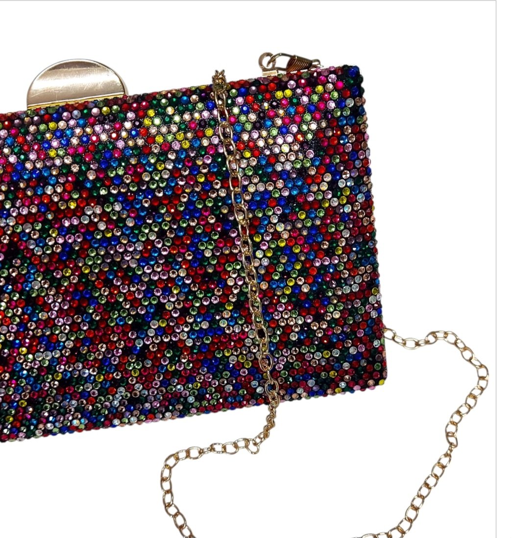 Precioso y elegante bolso de fiesta recubierto con cristalitos multicolor, con cadenita para colgar y cierre dorado