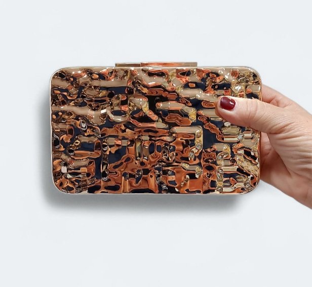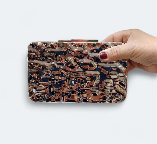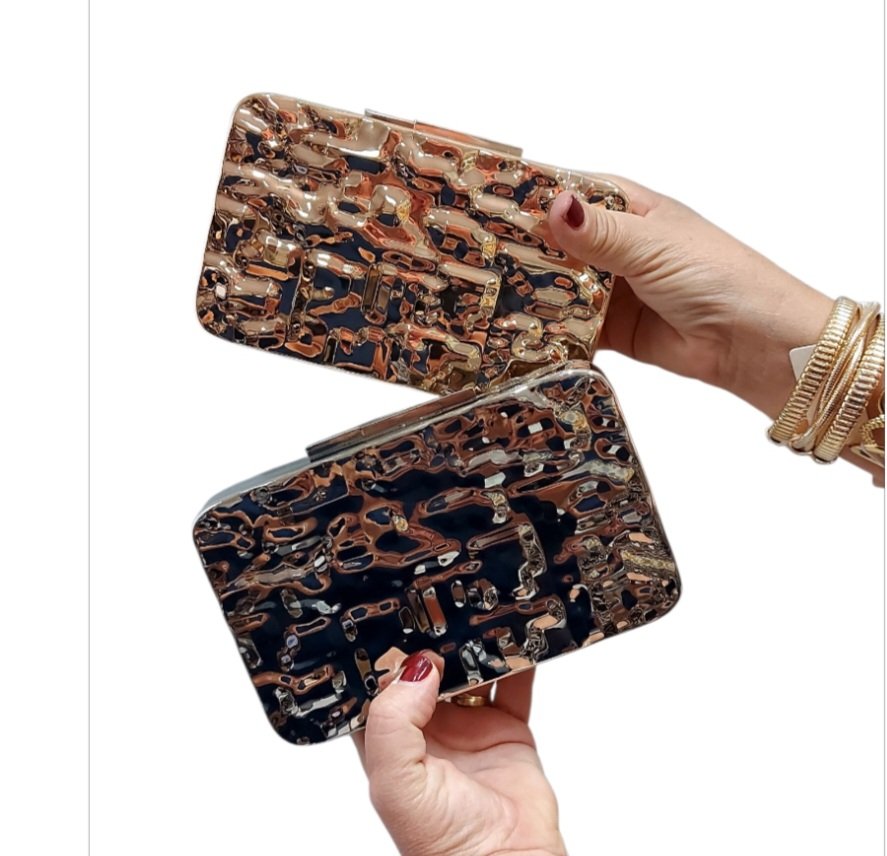 El bolso Roma, presenta un diseño metálico con un distintivo acabado texturizado o «martillado» que les otorga un aspecto único y elegante. Dispone de cadenita para colgarse. Están disponibles en dos tonalidades principales: una en un tono dorado y otra en un tono plateado, lo que lo convierte en un accesorio llamativo para eventos.