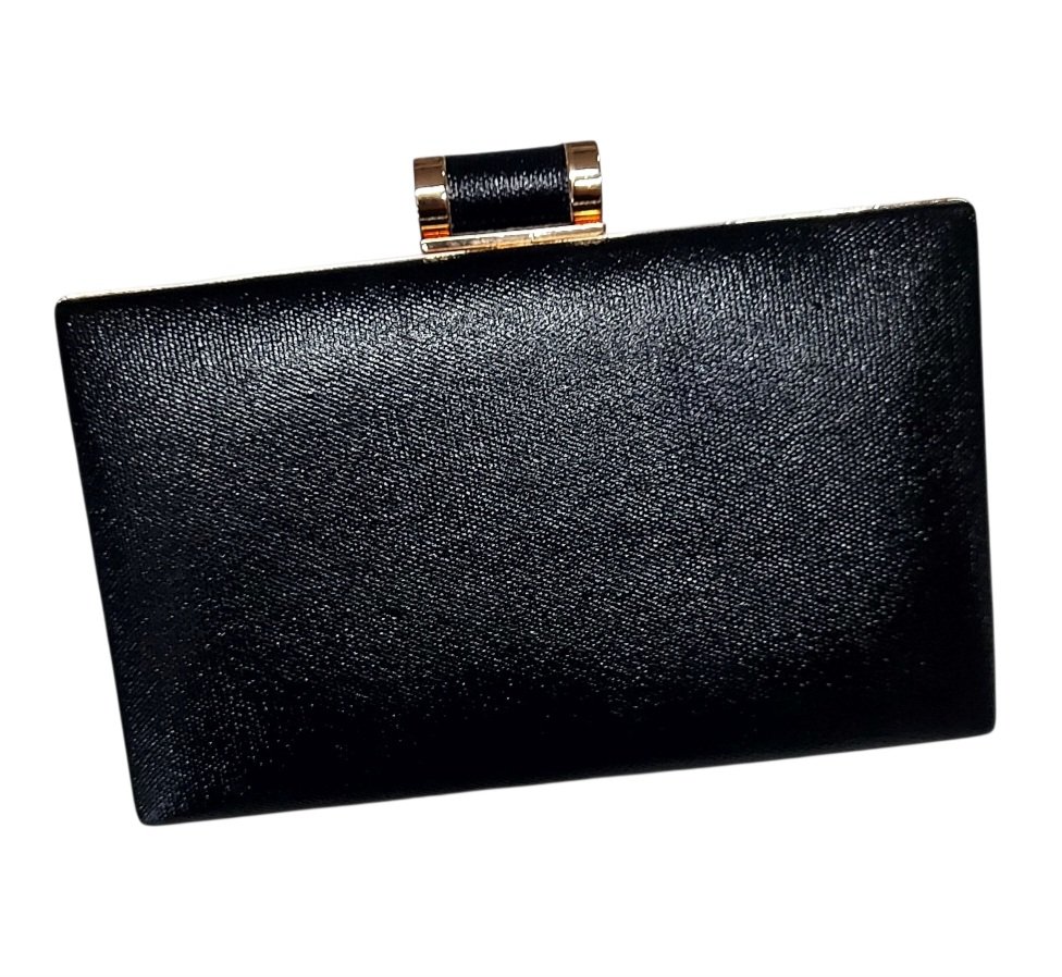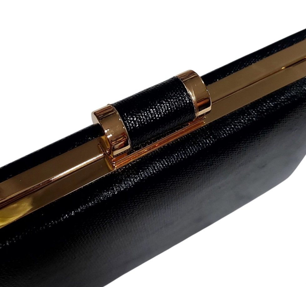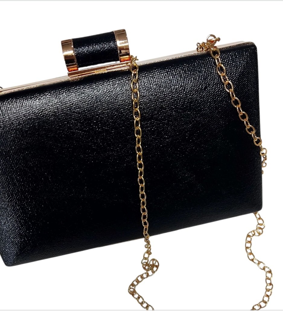 Precioso y elegante bolso de fiesta con cadenita para colgar tipo clutch, color negro con filo, cadena y cierre dorado