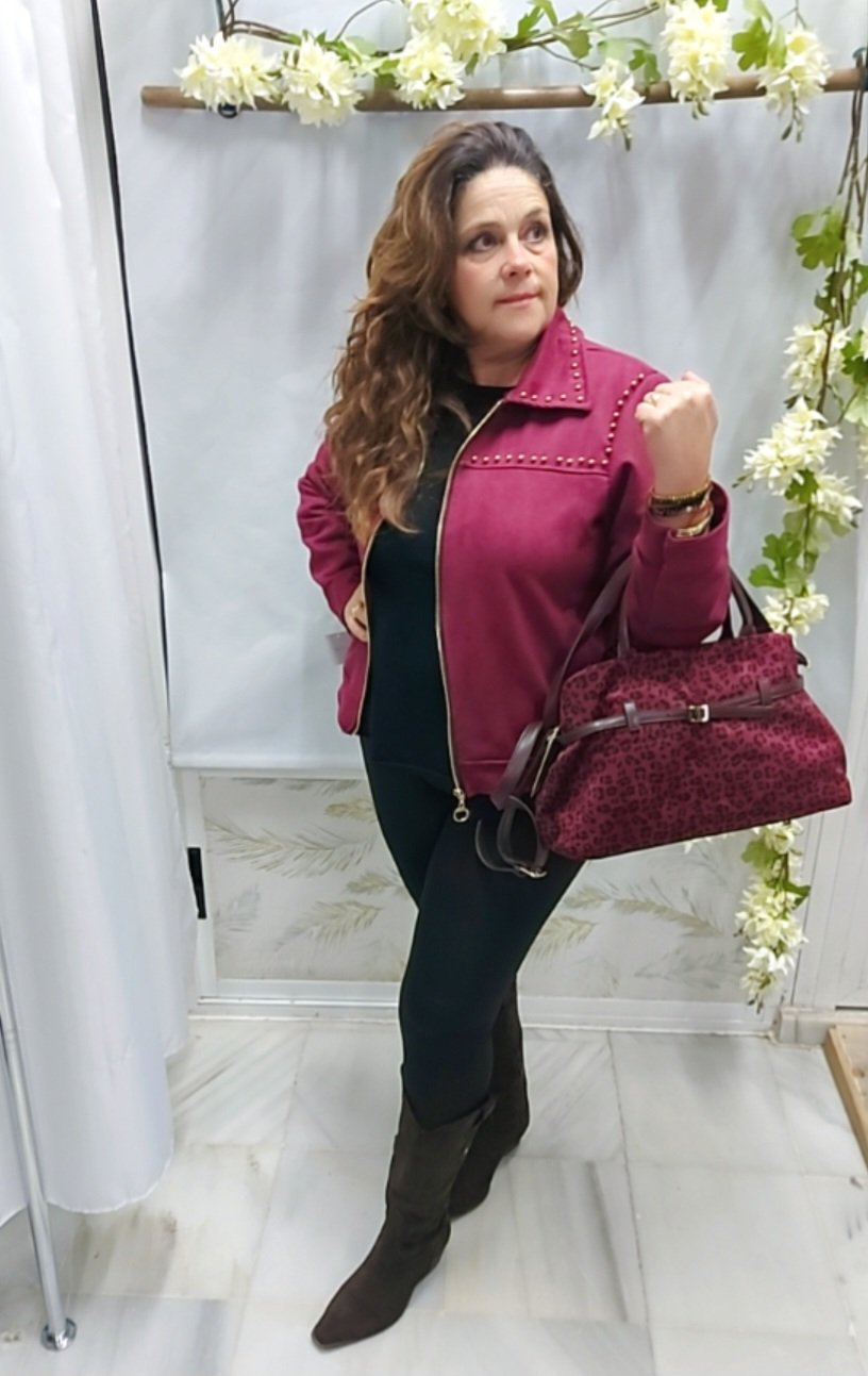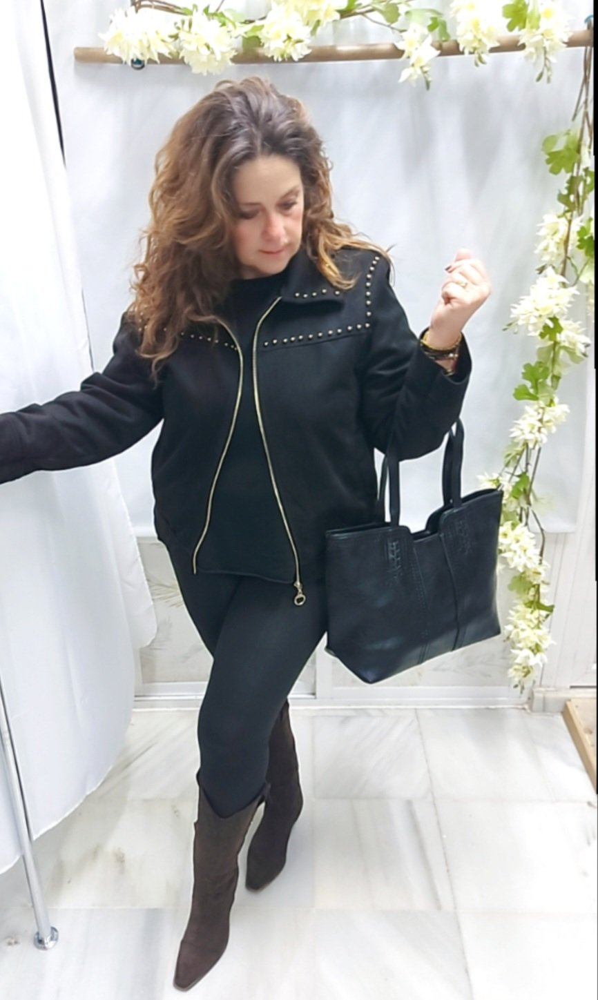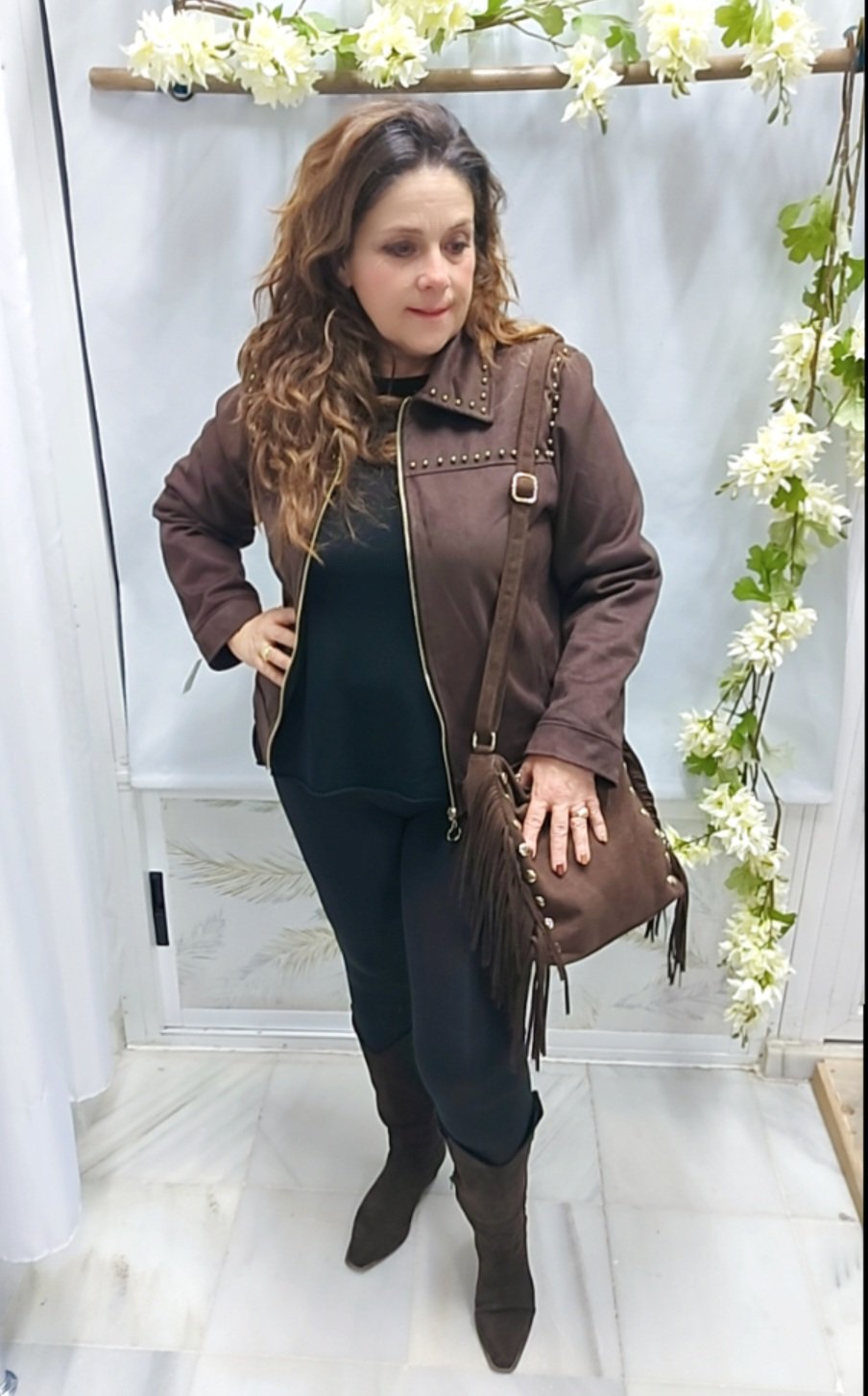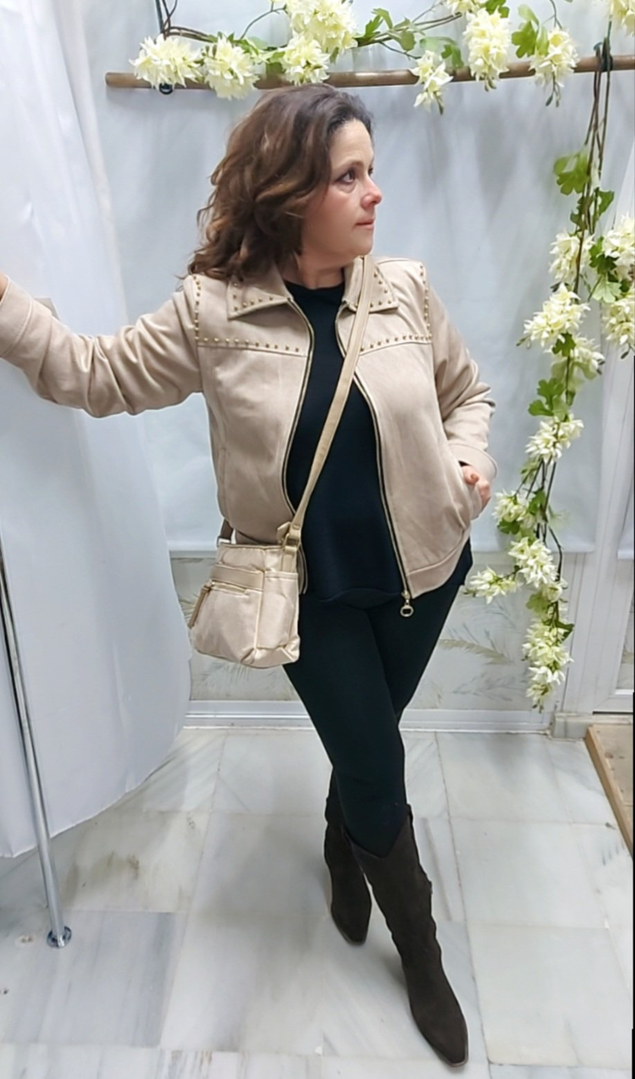Esta chaqueta bomber es una prenda de antelina versátil y moderna, ideal para cualquier ocasión casual. Su diseño presenta un cierre de cremallera frontal, y un detalle de tachuelas en el cuello y los hombros que le añade un toque de estilo único. Es una pieza cómoda y elegante que se adapta fácilmente a diferentes looks.