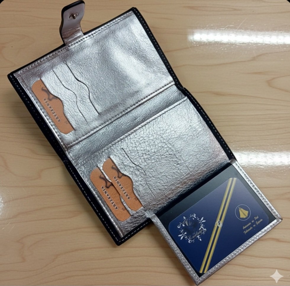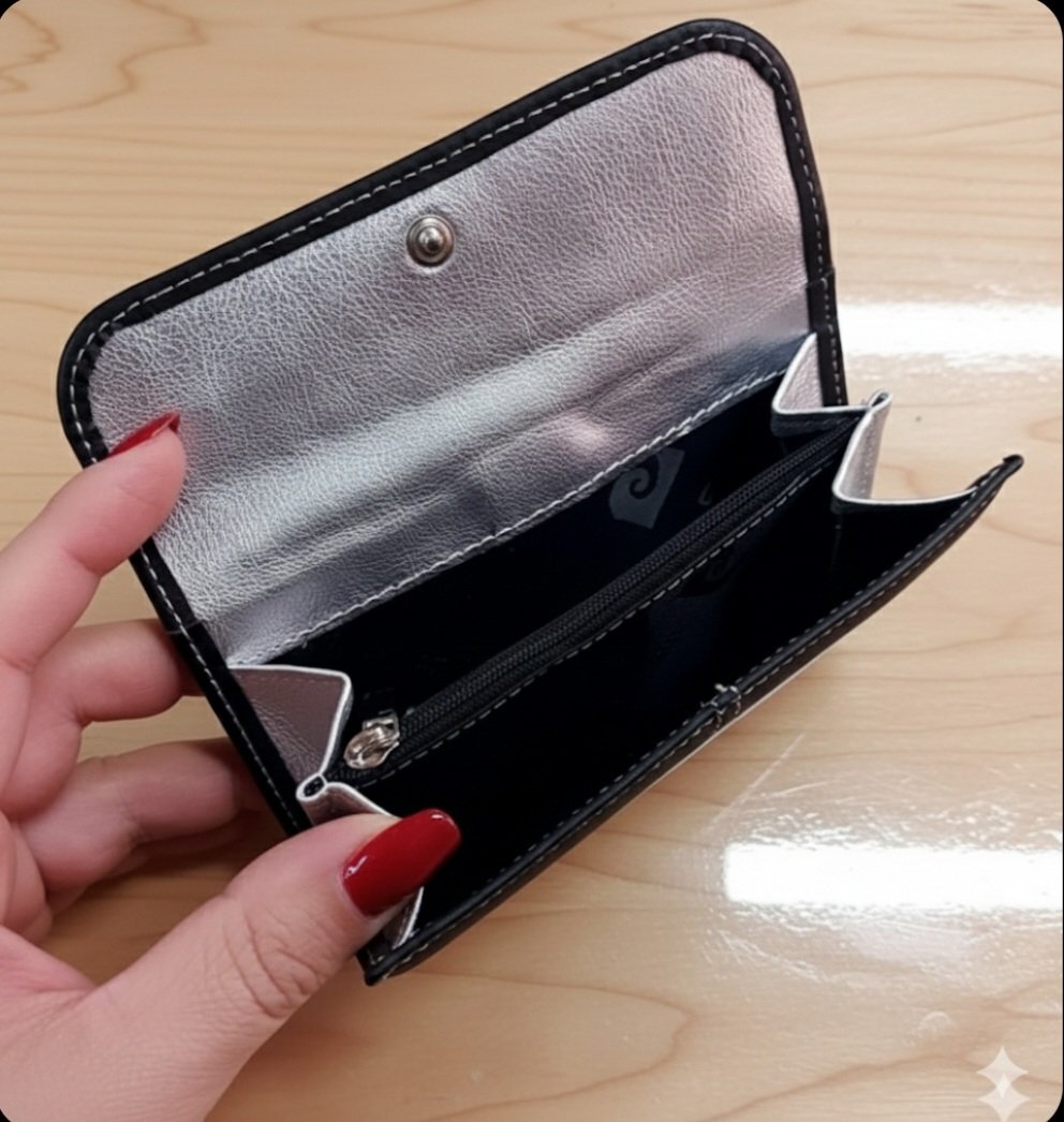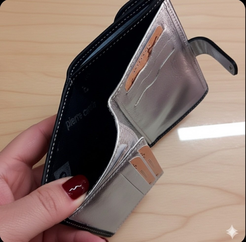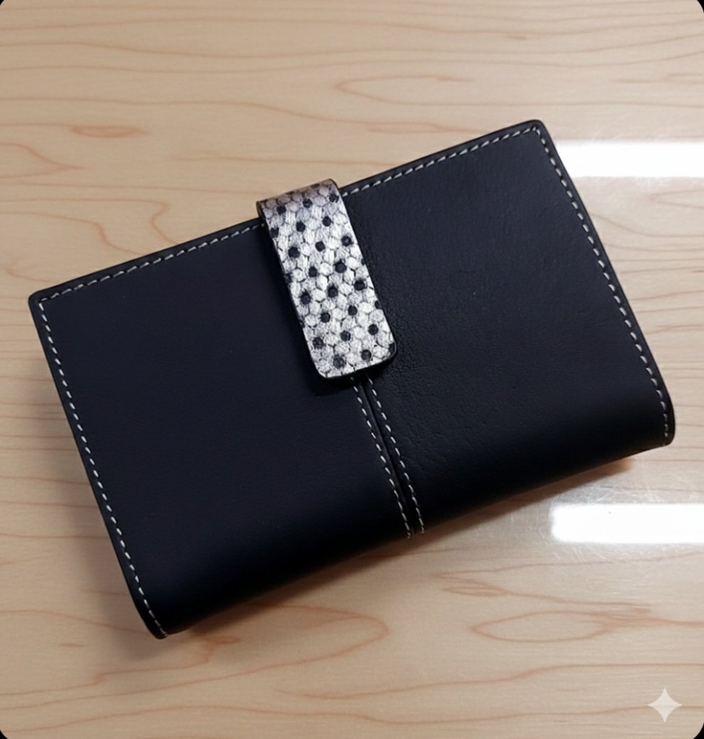 La cartera Luccia presenta un diseño clásico con un cierre distintivo de tira en piel con un patrón de puntos en tono plateado, que le añade un toque moderno y único. Las costuras decorativas a lo largo de los bordes resaltan su forma y acabado de calidad. Su formato tipo biblia ofrece una gran capacidad para tarjetas y otros elementos esenciales, combinando estilo y practicidad.