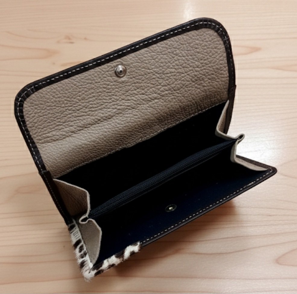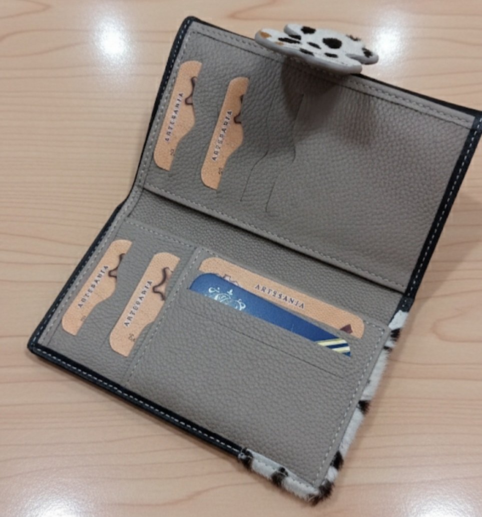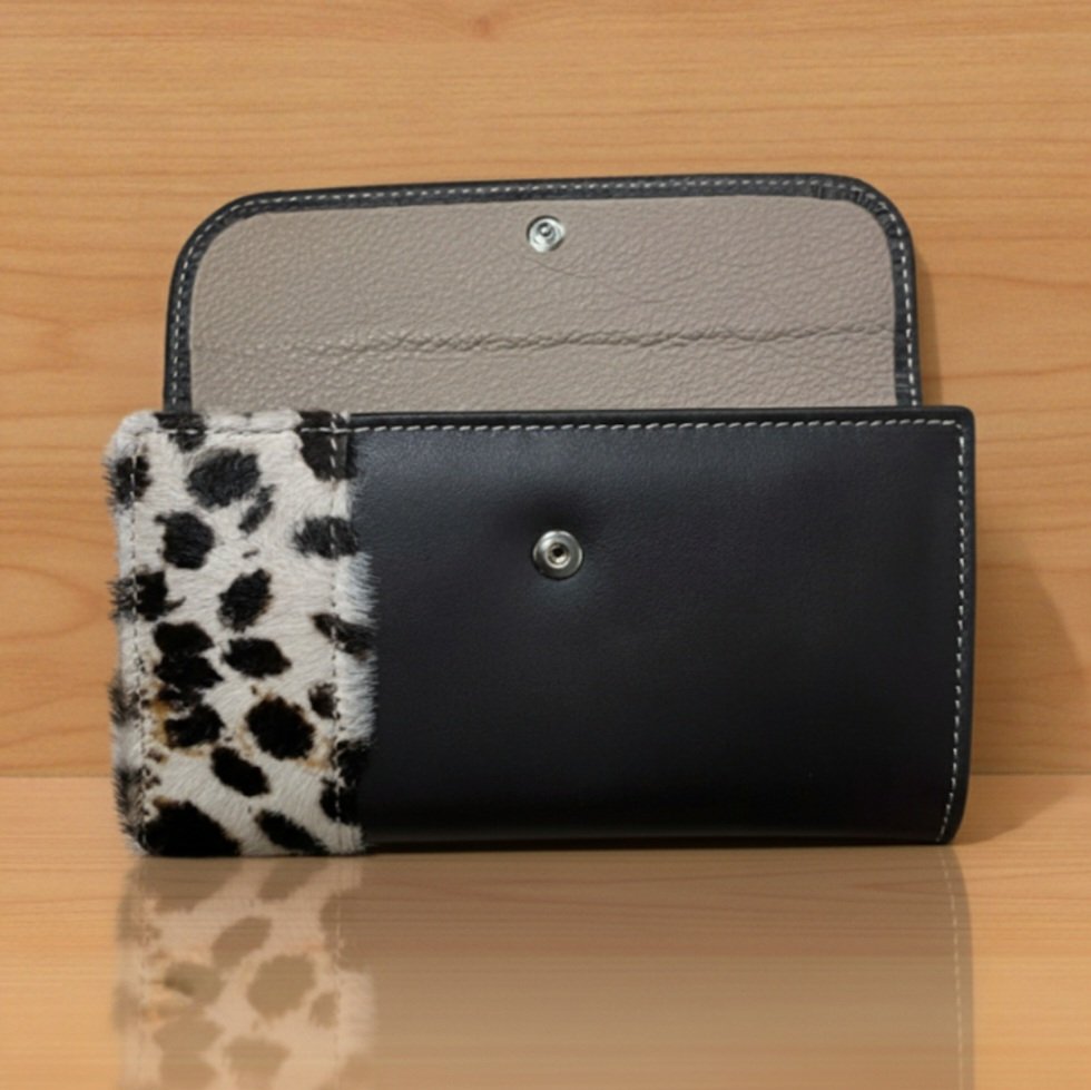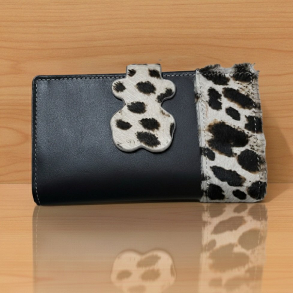 Esta elegante cartera combina la sofisticación del cuero marrón oscuro con un toque atrevido de pelito con estampado animal. El diseño se realza con costuras blancas contrastantes y un distintivo cierre con forma de oso. Es un accesorio compacto y moderno, ideal para quienes buscan funcionalidad con un estilo llamativo y de alta calidad.