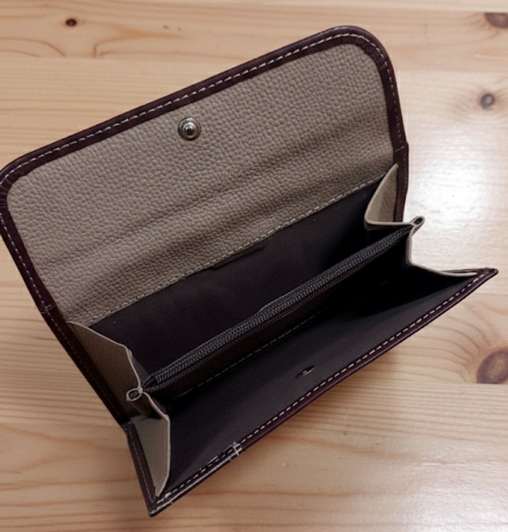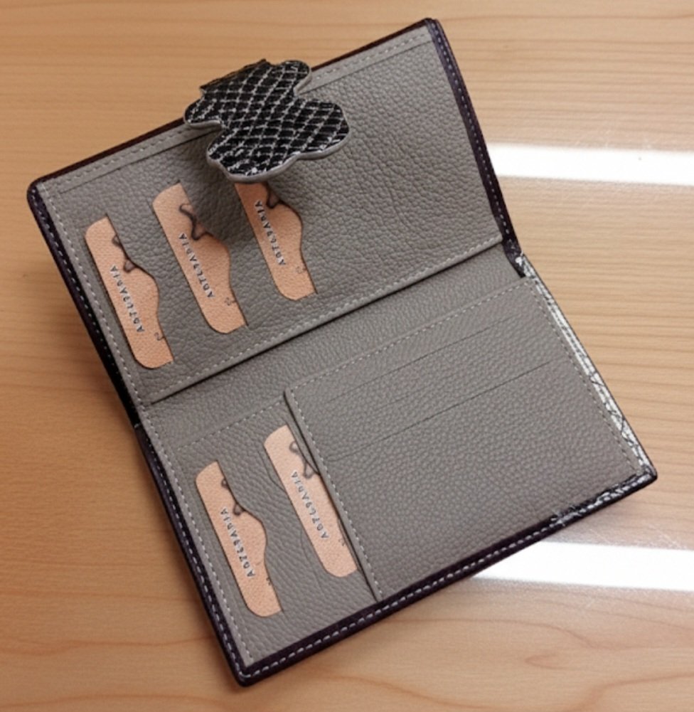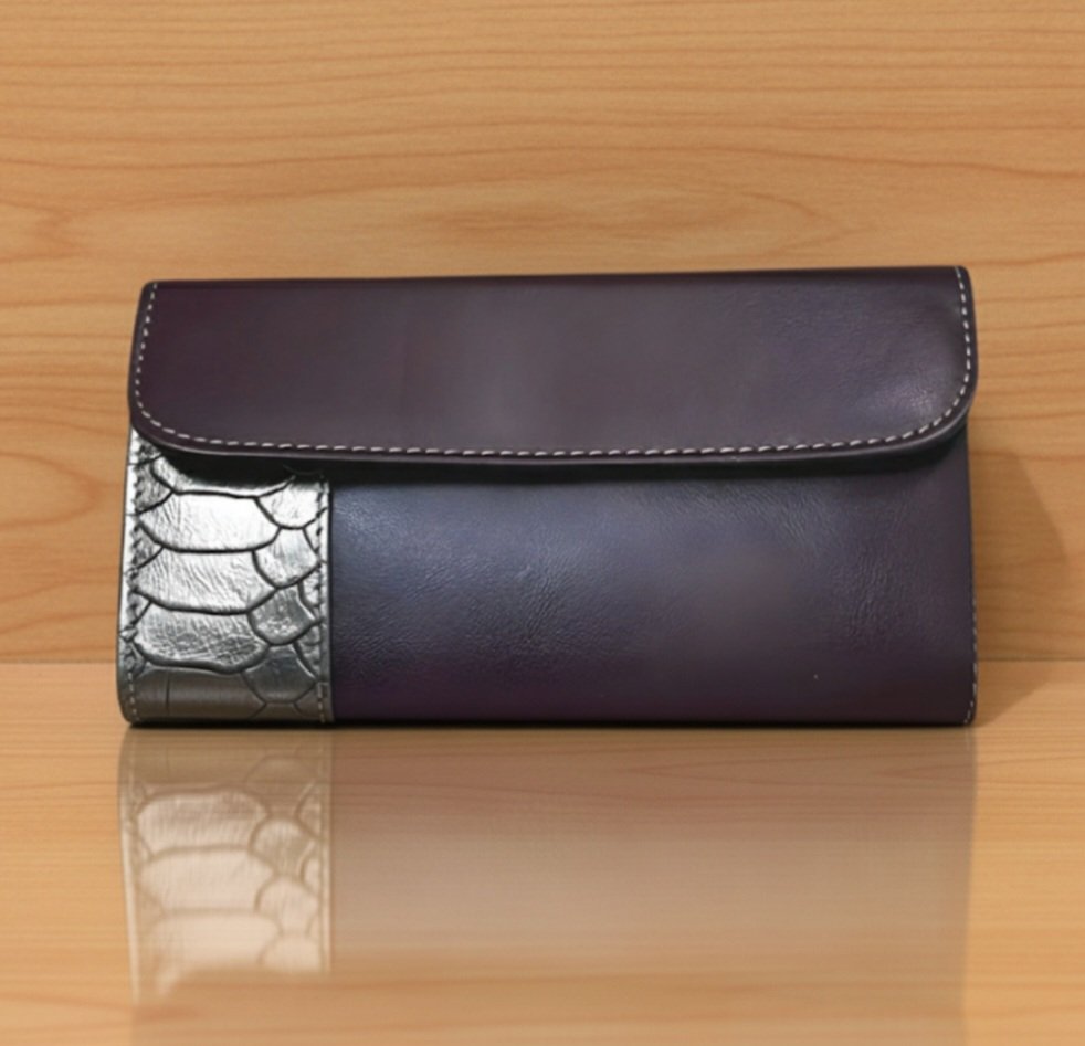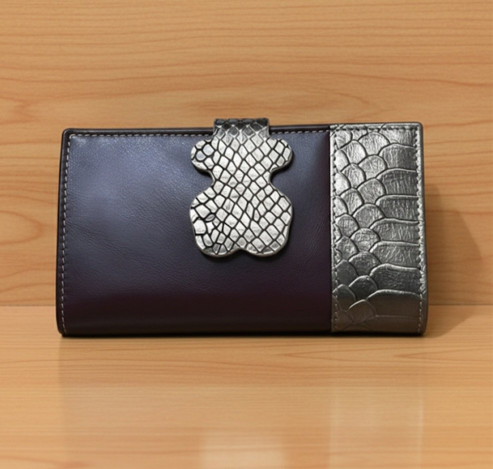 Esta elegante cartera de piel en tono burdeos oscuro presenta un diseño sofisticado y compacto. Destaca por un aplique lateral y un distintivo cierre con forma de oso, ambos con un acabado metalizado y textura de piel de serpiente o cocodrilo, que añaden un toque de lujo y modernidad al accesorio. Ideal para llevar lo esencial con estilo.
