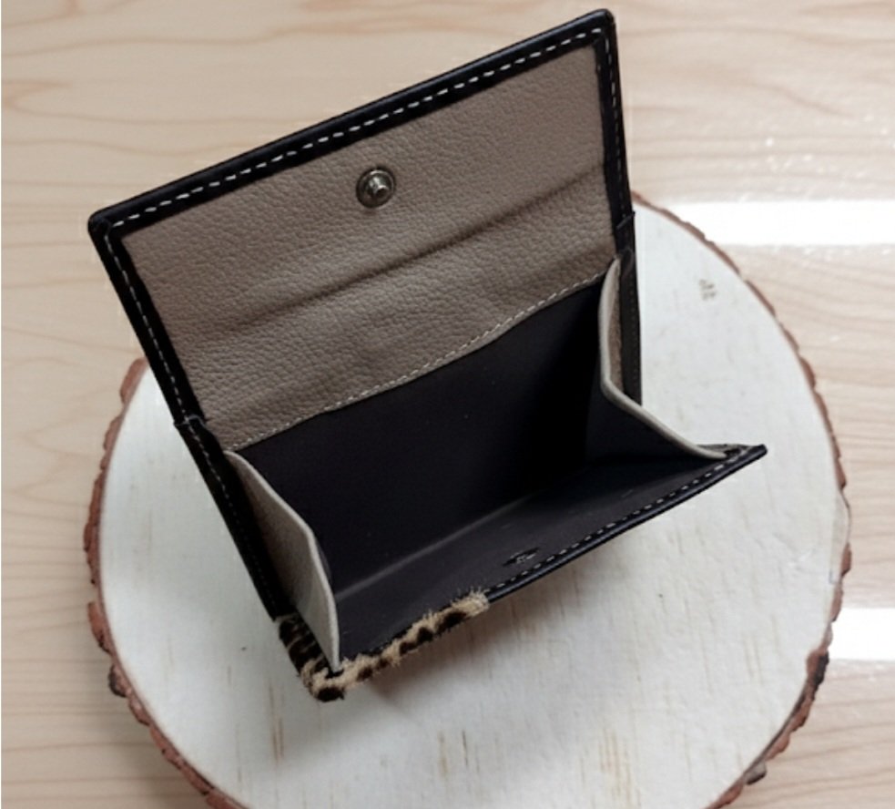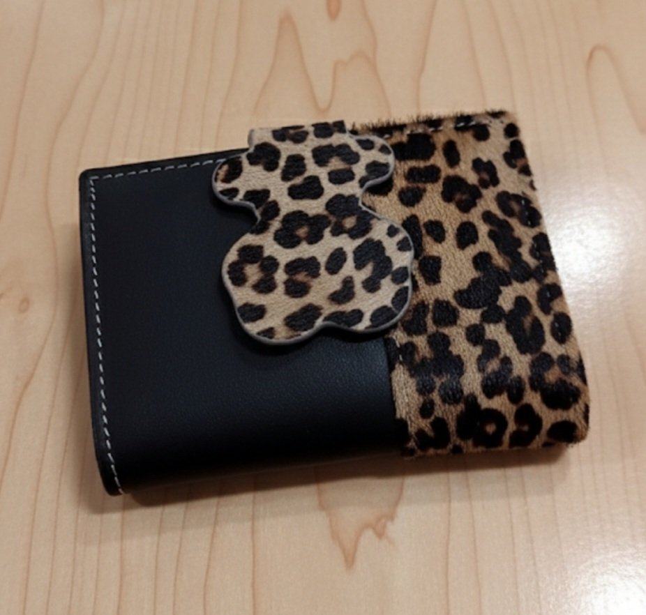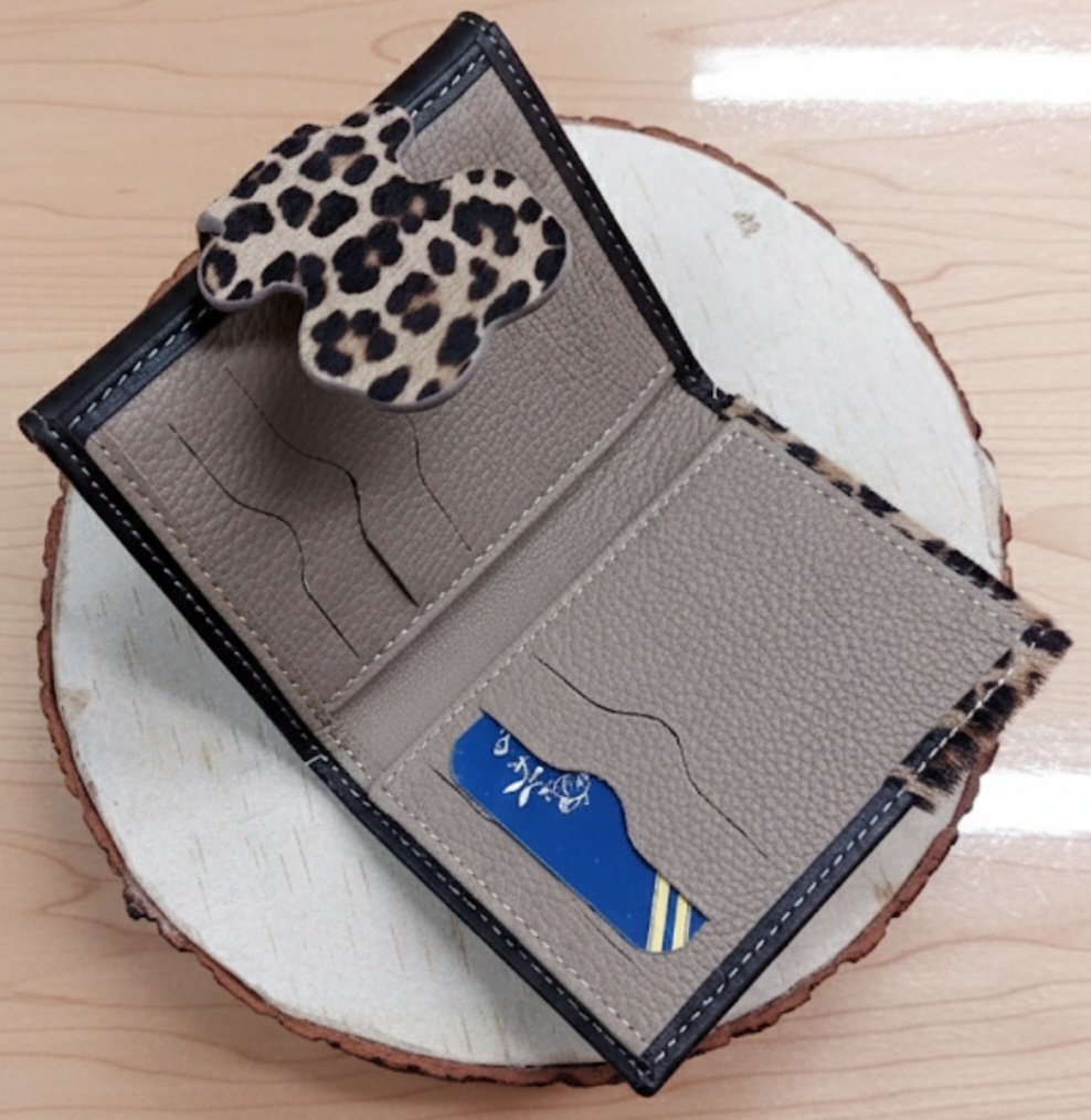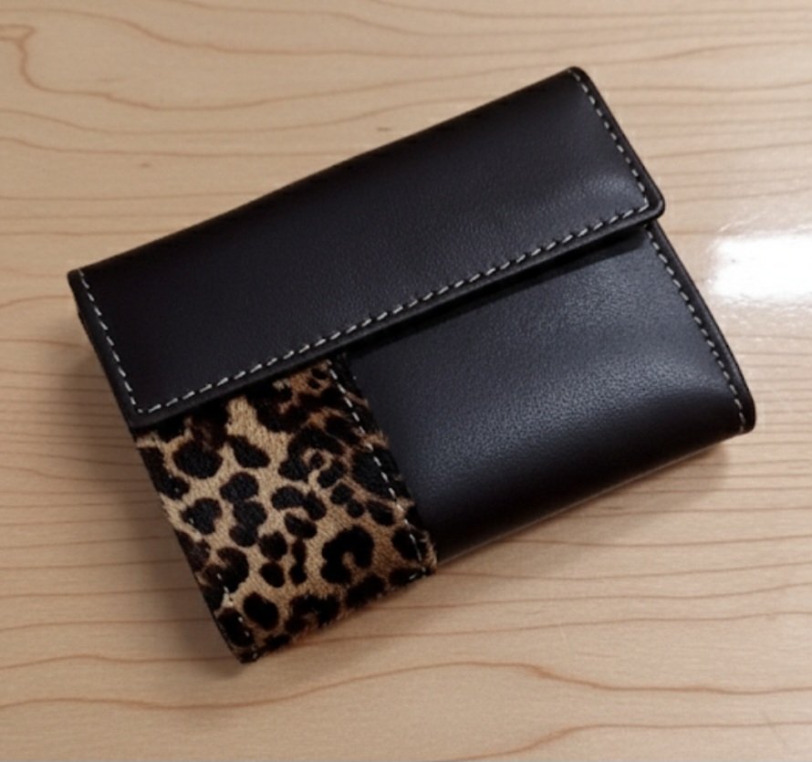Esta elegante cartera combina la sofisticación del cuero marrón oscuro con un toque atrevido de pelito con estampado animal. El diseño se realza con costuras blancas contrastantes y un distintivo cierre con forma de oso. Es un accesorio compacto y moderno, ideal para quienes buscan funcionalidad con un estilo llamativo y de alta calidad.
