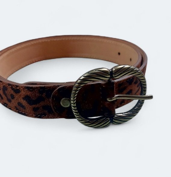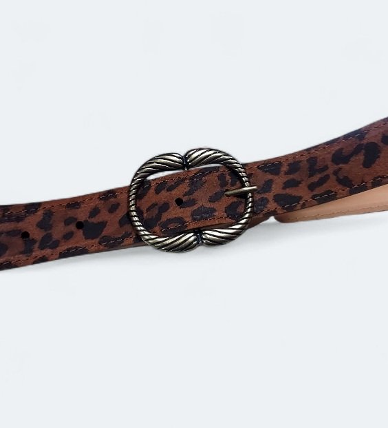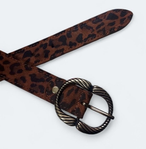 El cinturón Leo es un accesorio de piel de moda con un estampado de animal print que simula el patrón de leopardo, predominantemente en tonos marrones y negros. Presenta una hebilla metálica de diseño intrincado y ornamentado, con un acabado en color bronce oscuro, que añade un toque distintivo al diseño general del cinturón.