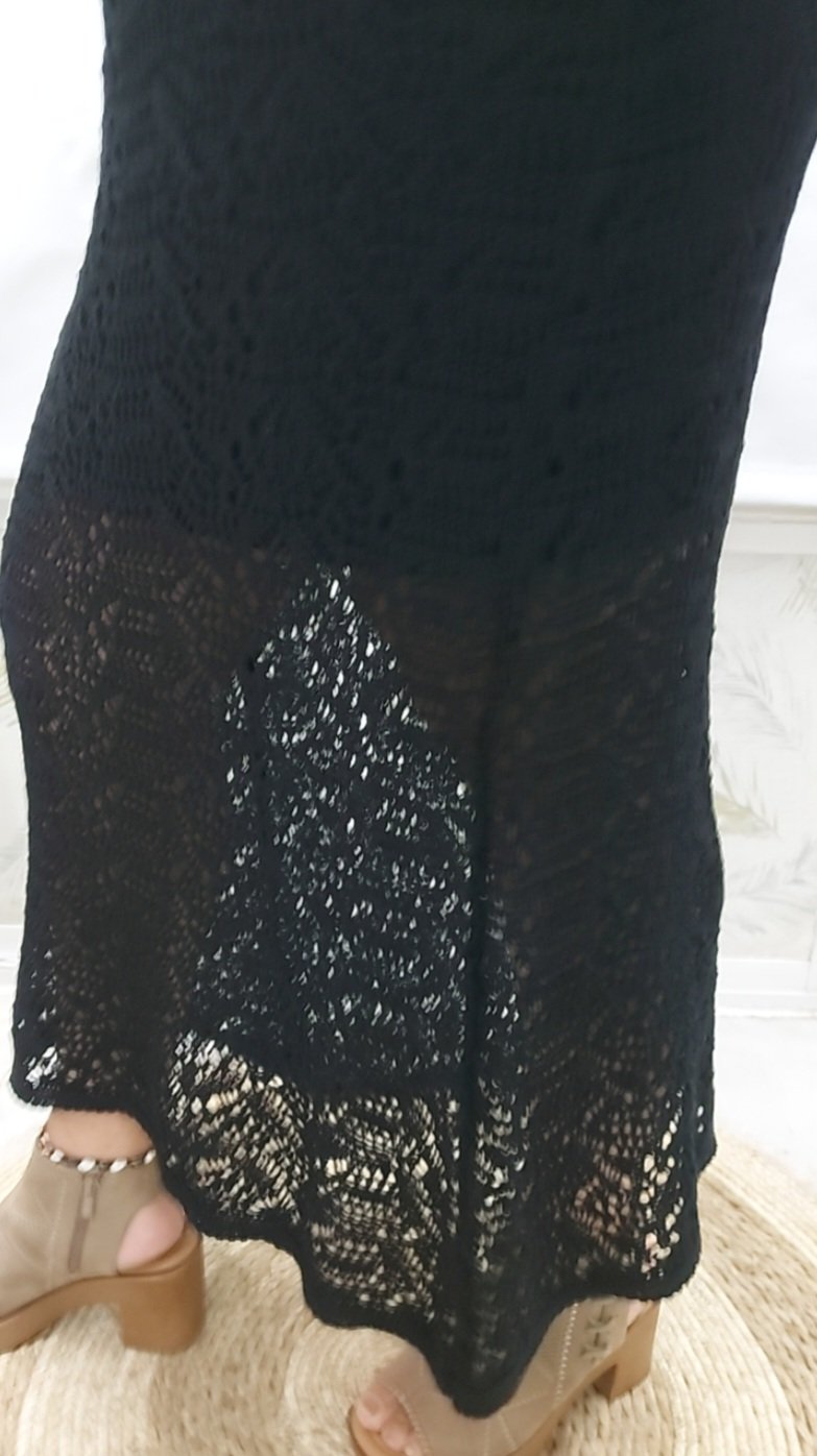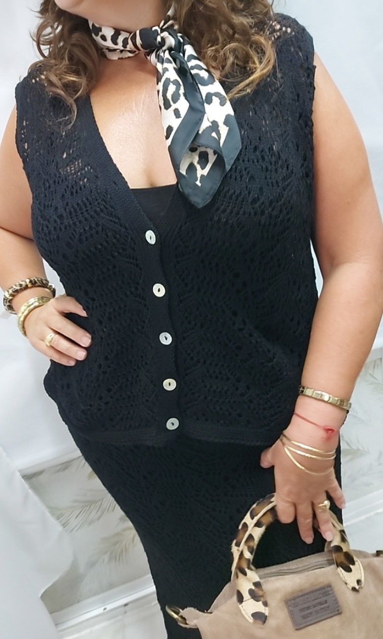 El conjunto se compone de un chaleco sin mangas de punto calado en color negro, con escote en pico y una hilera de botones claros en la parte delantera y una falda larga negra a juego con la parte superior, con forro a media pierna del mismo color.
