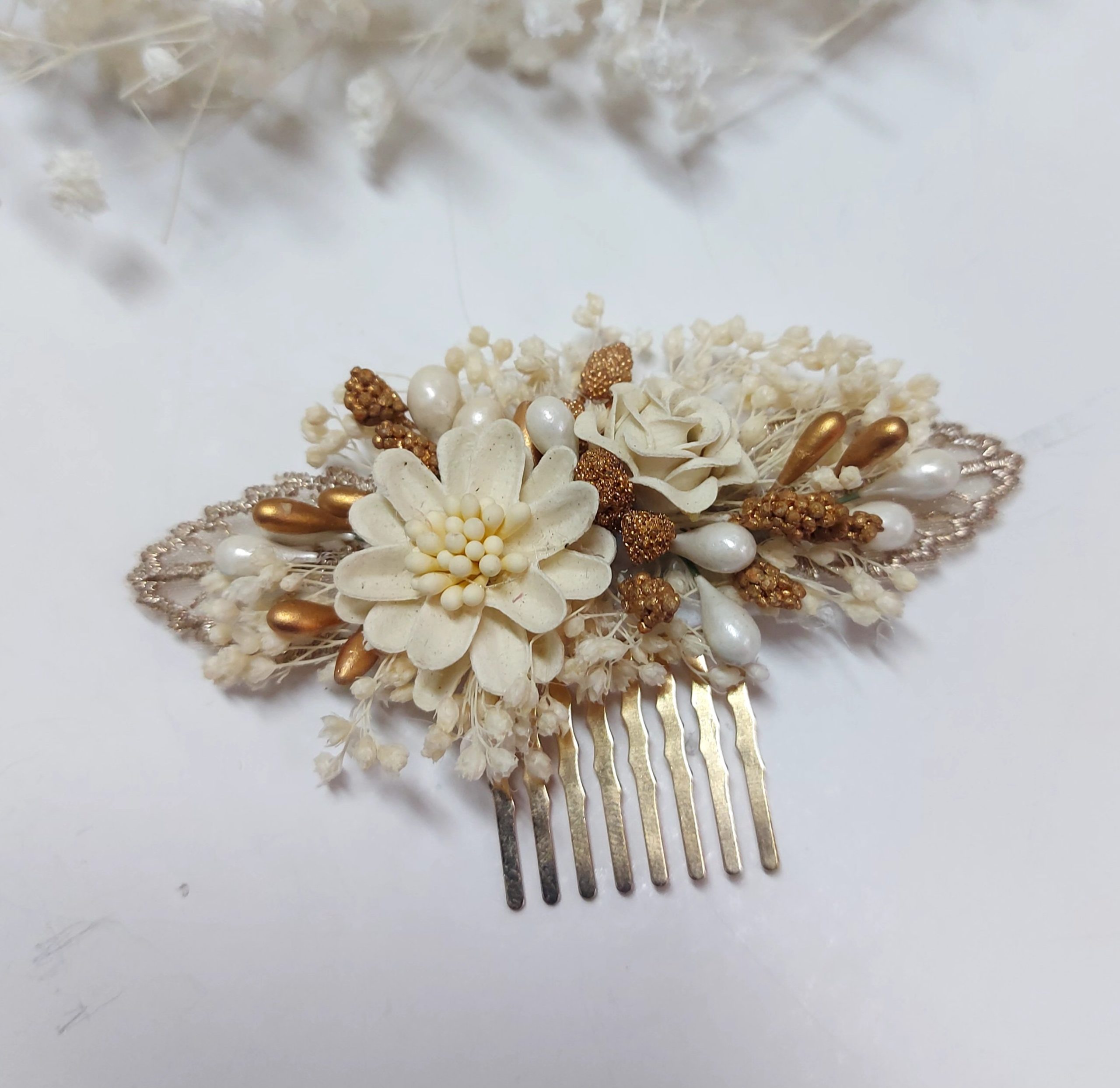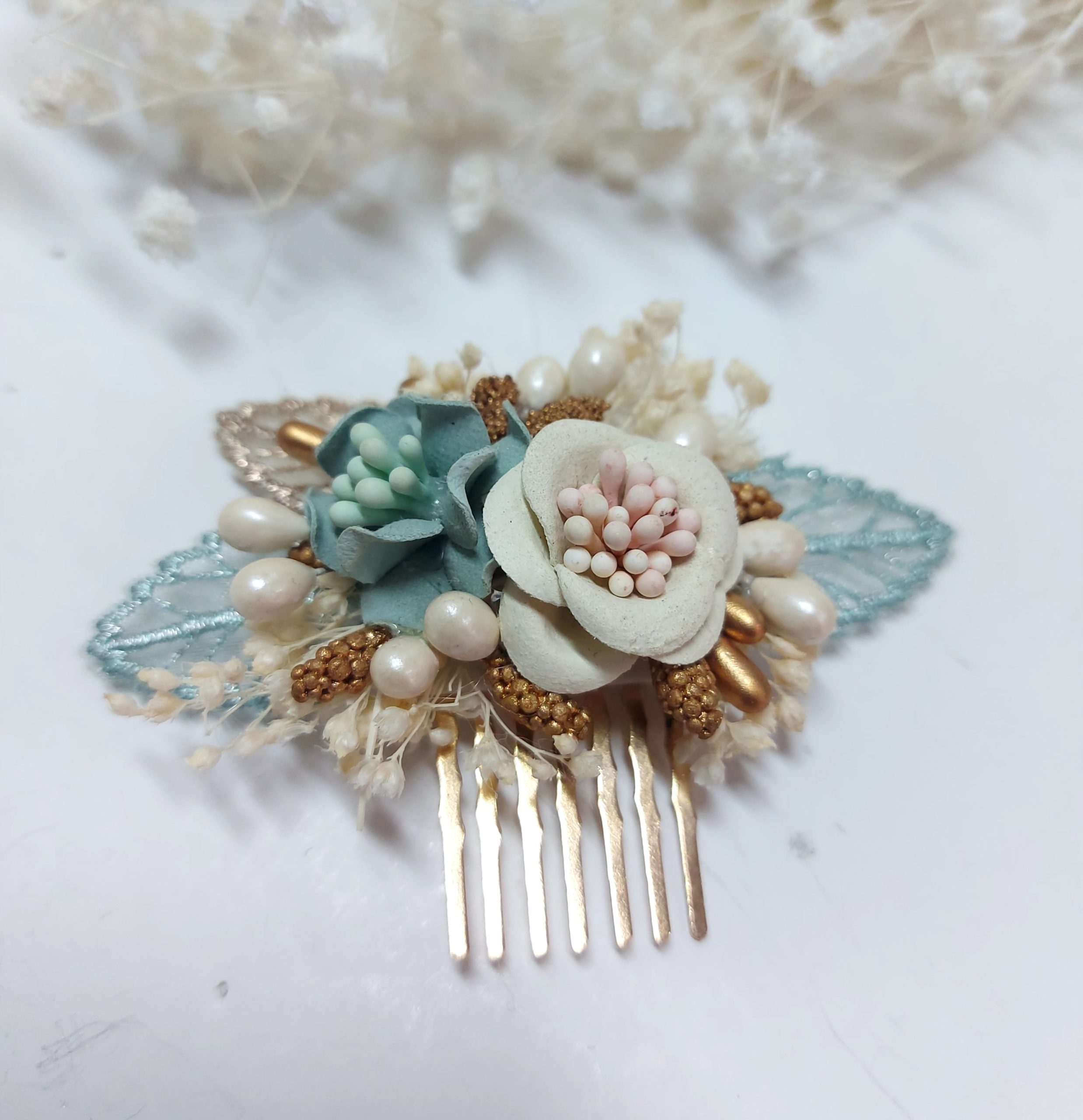 Este tocado elaborado con flores artificiales y preservadas aporta un toque de frescura y naturalidad como complemento ideal para cualquier peinado.