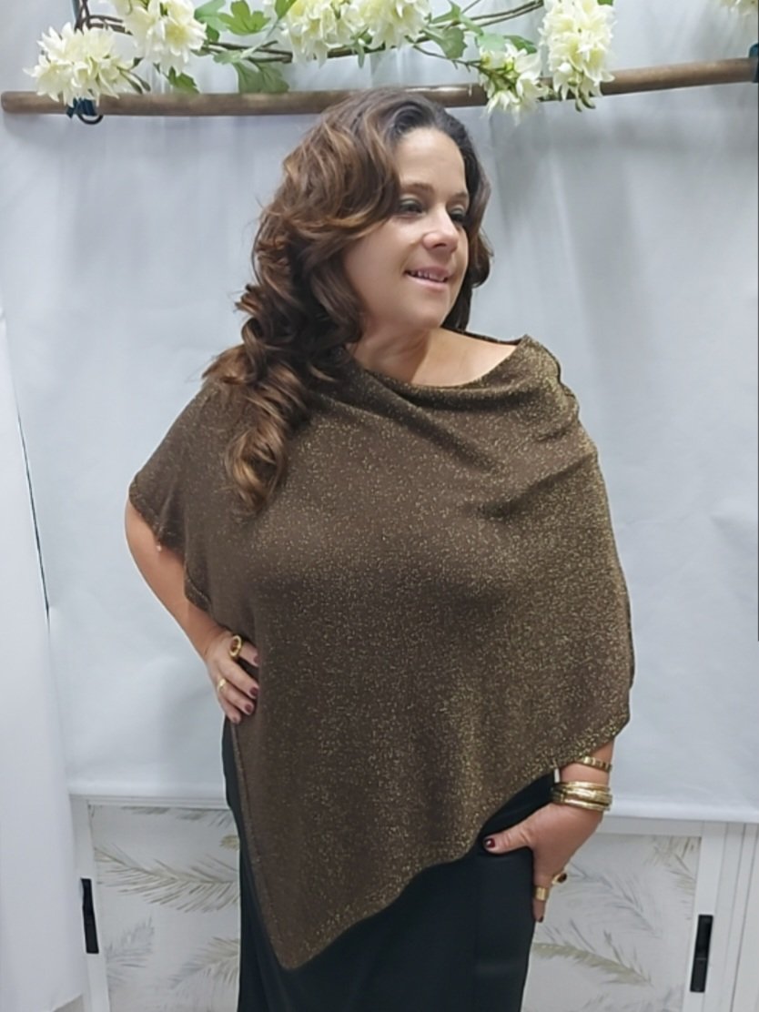 El poncho Ecuador tiene un diseño asimetrico, creando una silueta fluida y elegante Su tejido tiene un ligero brillo o destello metálico. La prenda cae de forma suelta sobre el cuerpo, llegando aproximadamente hasta la cadera en su parte más larga.