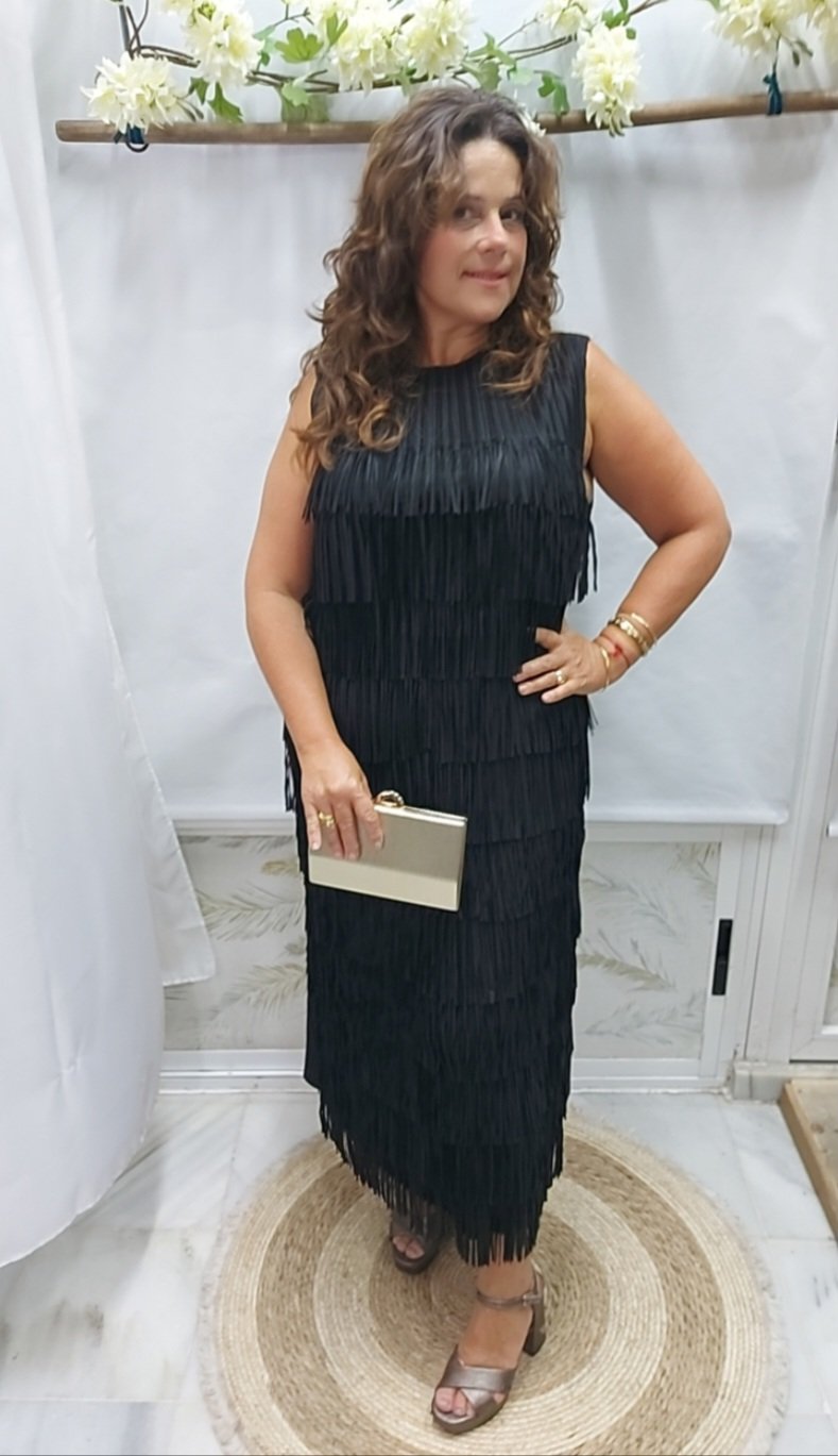Vestido negro con flecos en la parte delantera y tejido de acordeón por lo que da opción a varias tallas llegando hasta una 50 aproximadamente